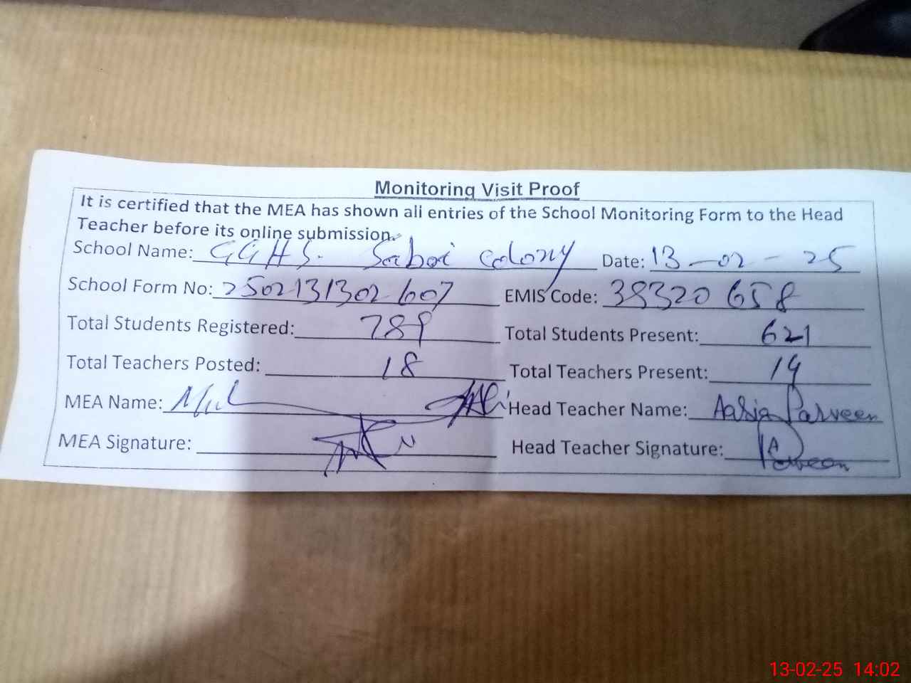| Attendance Register | Head Teacher | MEA with School | Visit Proof |