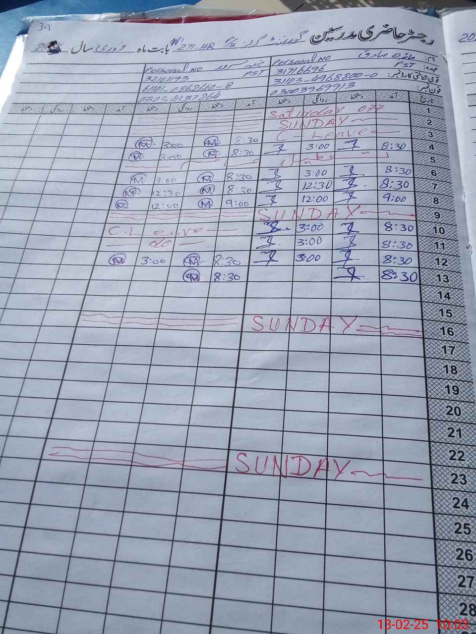 | CNIC | Full Name | Designation | R/C | Absence during last cal. month |
