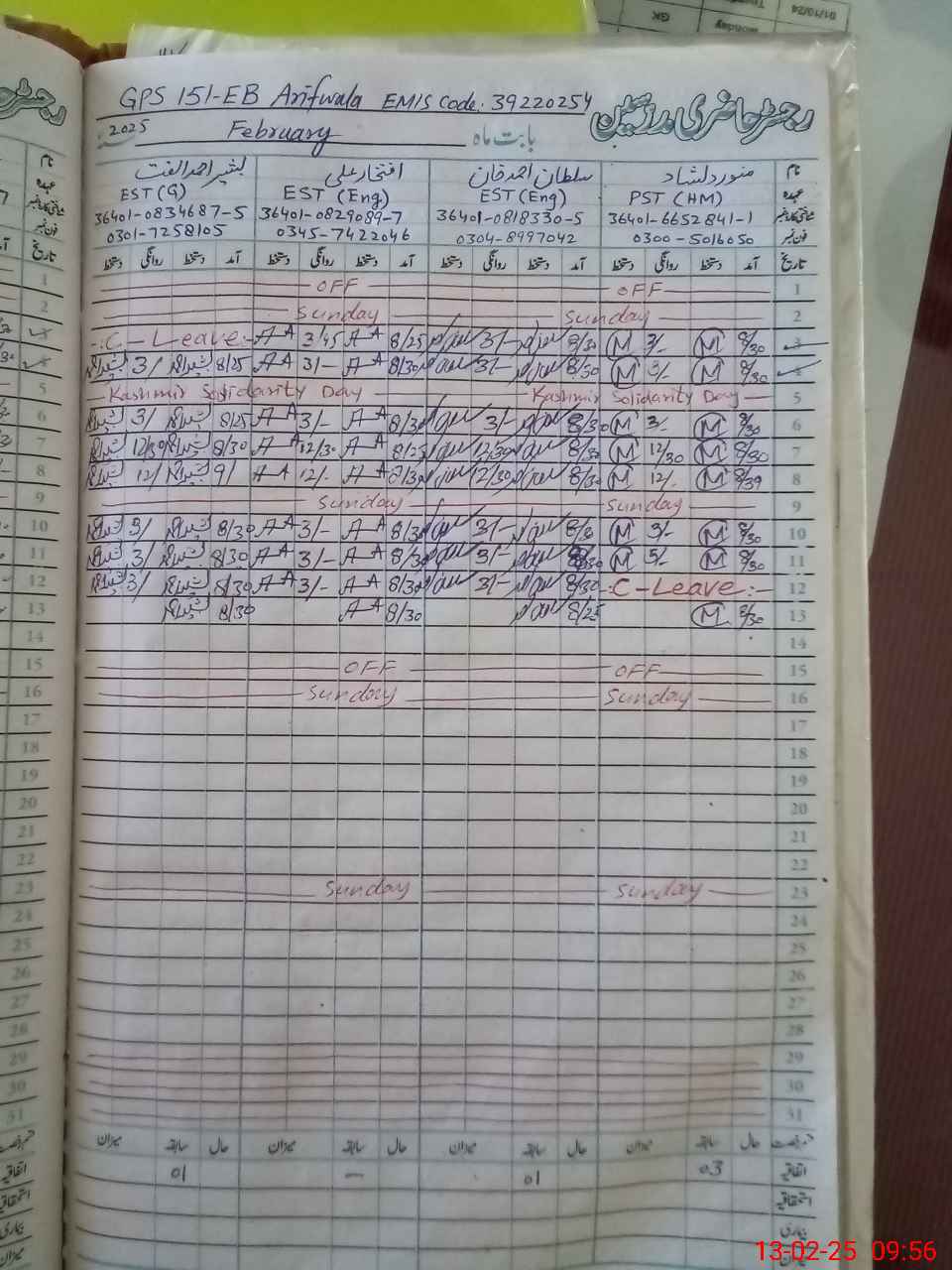 | CNIC | Full Name | Designation | R/C | Absence During Last Calender Month |