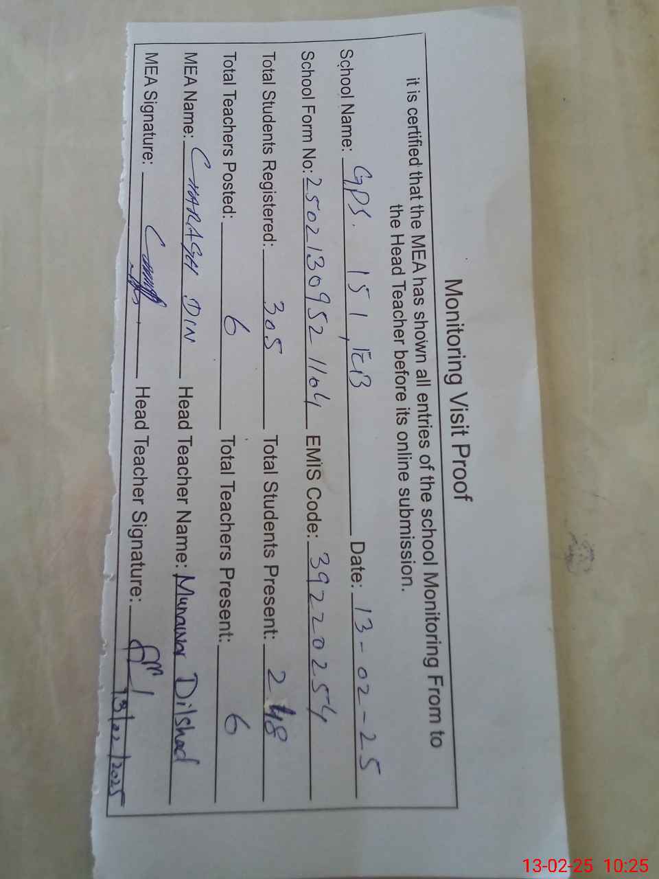 | Attendance Register | Head Teacher | MEA with School | Visit Proof |