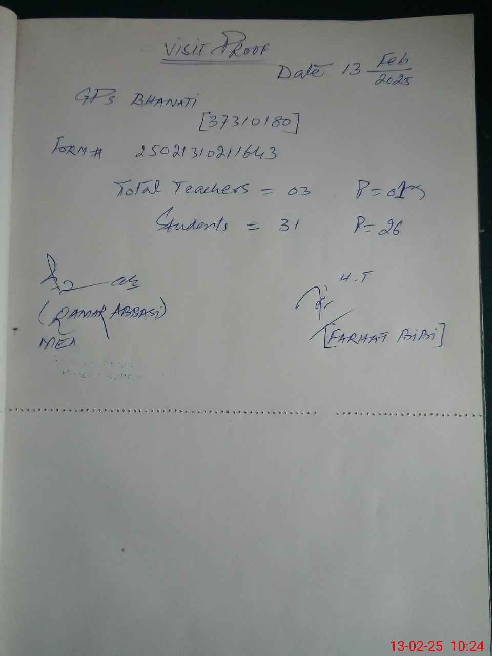 | Attendance Register | Head Teacher | MEA with School | Visit Proof |