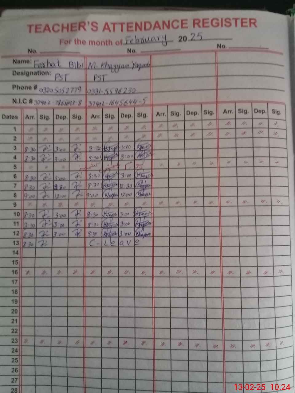 | CNIC | Full Name | Designation | R/C | Absence During Last Calender Month |