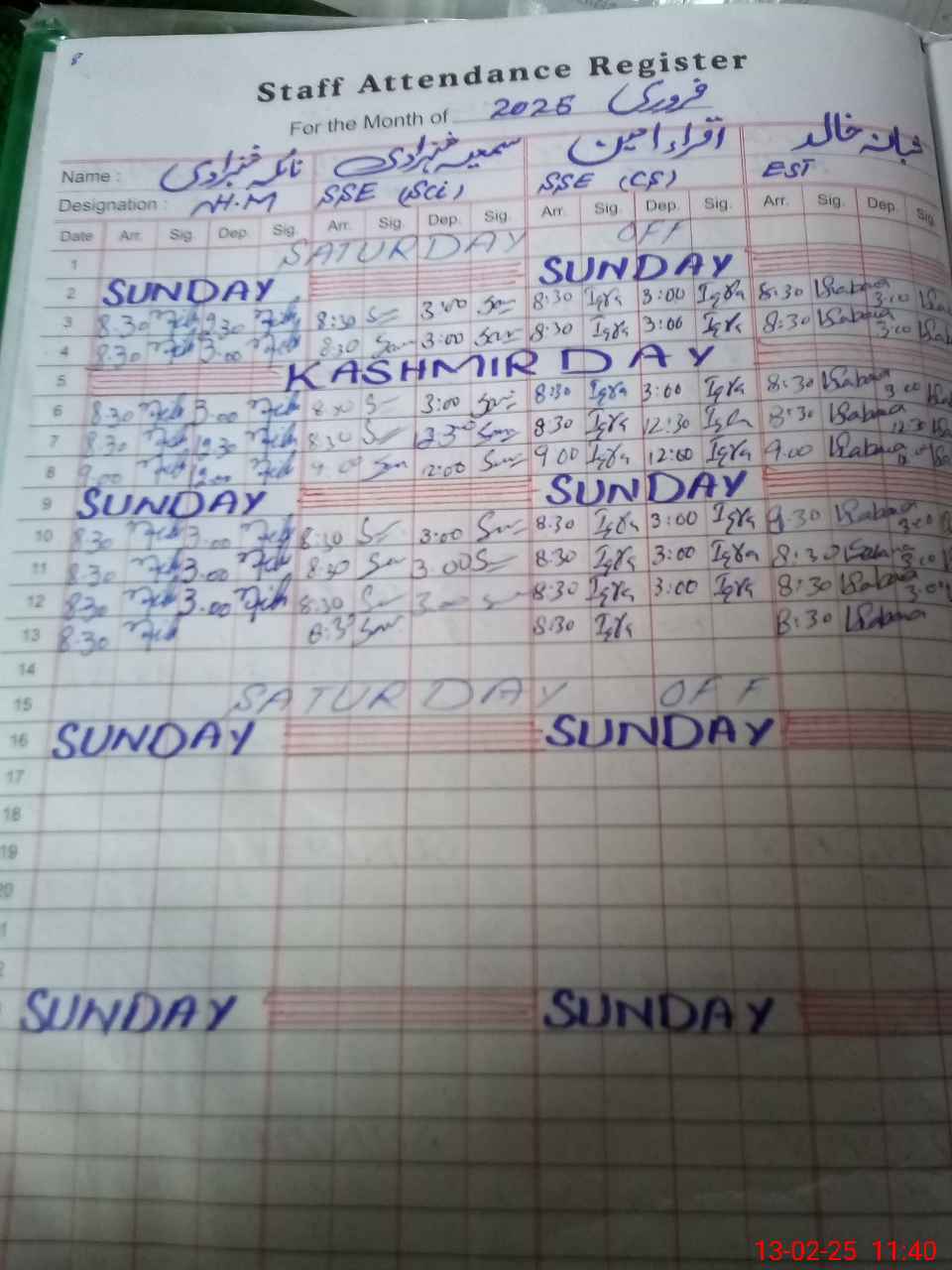 | CNIC | Full Name | Designation | R/C | Absence During Last Calender Month |