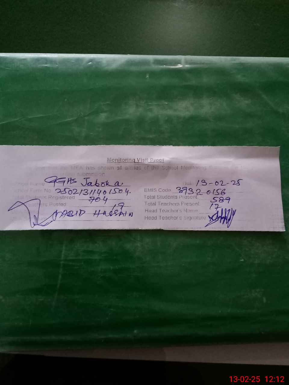 | Attendance Register | Head Teacher | MEA with School | Visit Proof |