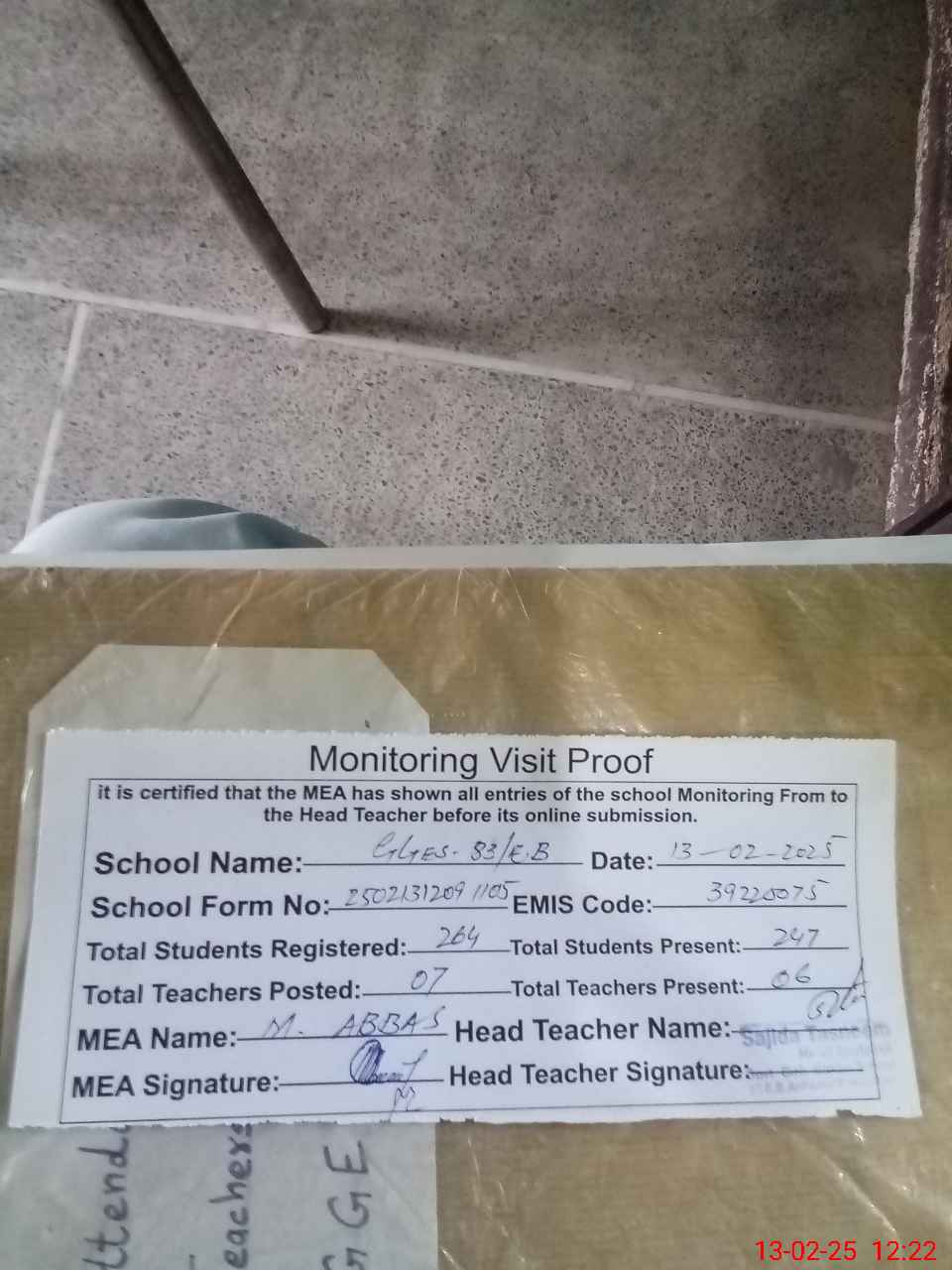 | Attendance Register | Head Teacher | MEA with School | Visit Proof |