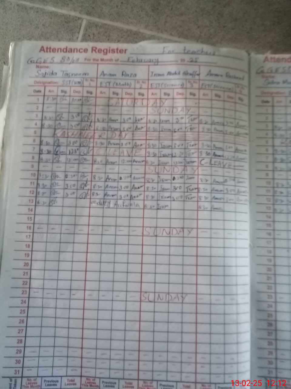 | CNIC | Full Name | Designation | R/C | Absence During Last Calender Month |