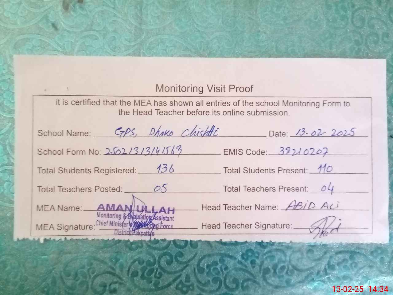 | EMIS Code: 39210207 | Name of School: GPS DHAKOO CHISHTI PO PAKPATTAN | |||