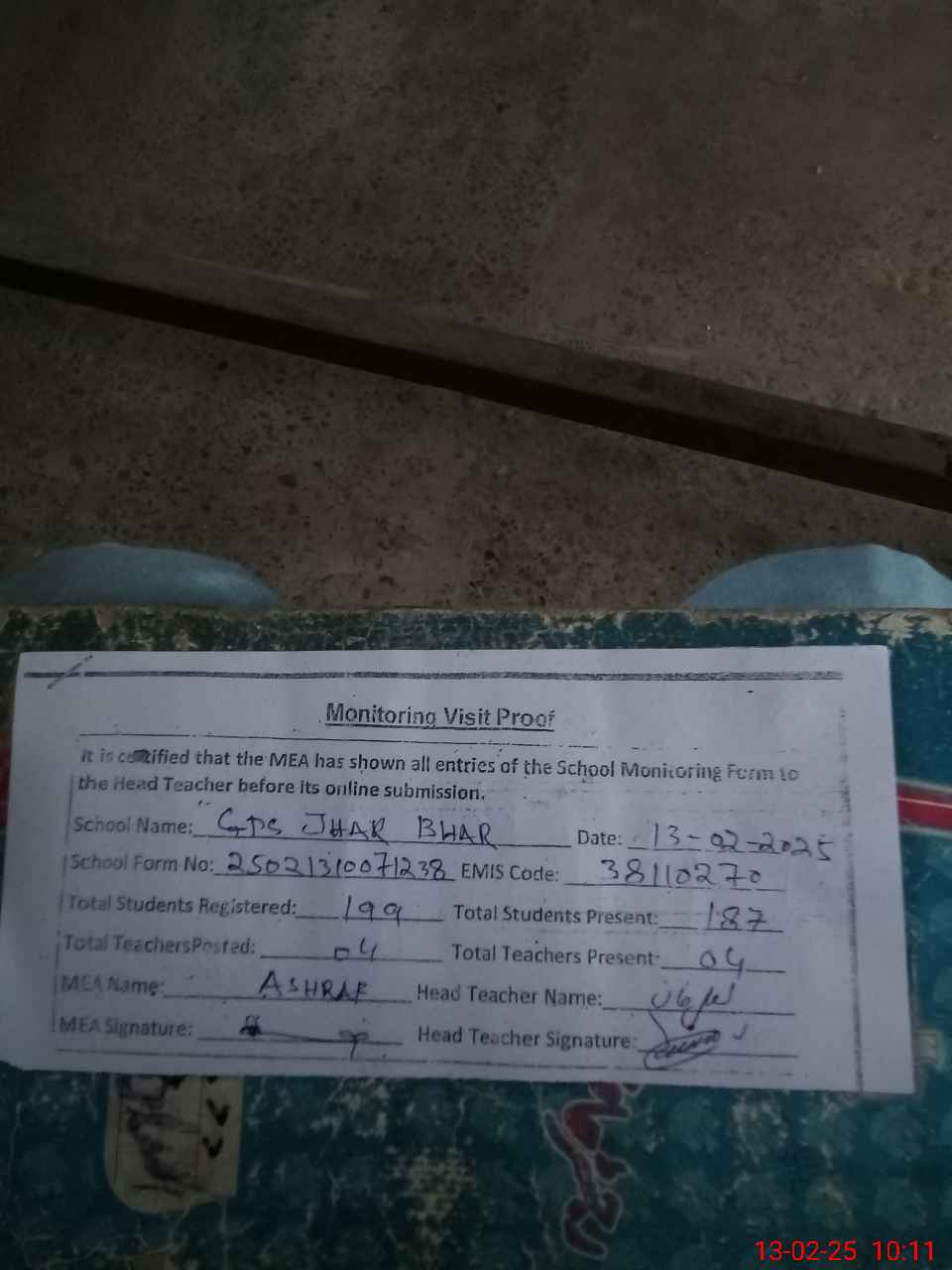 | Attendance Register | Head Teacher | MEA with School | Visit Proof |