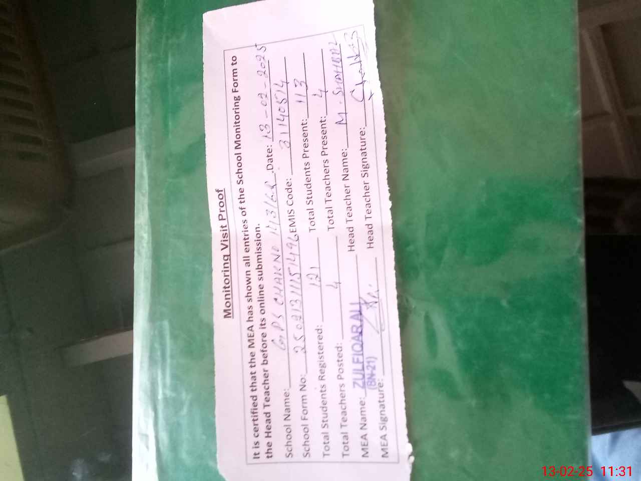 | Attendance Register | Head Teacher | MEA with School | Visit Proof |