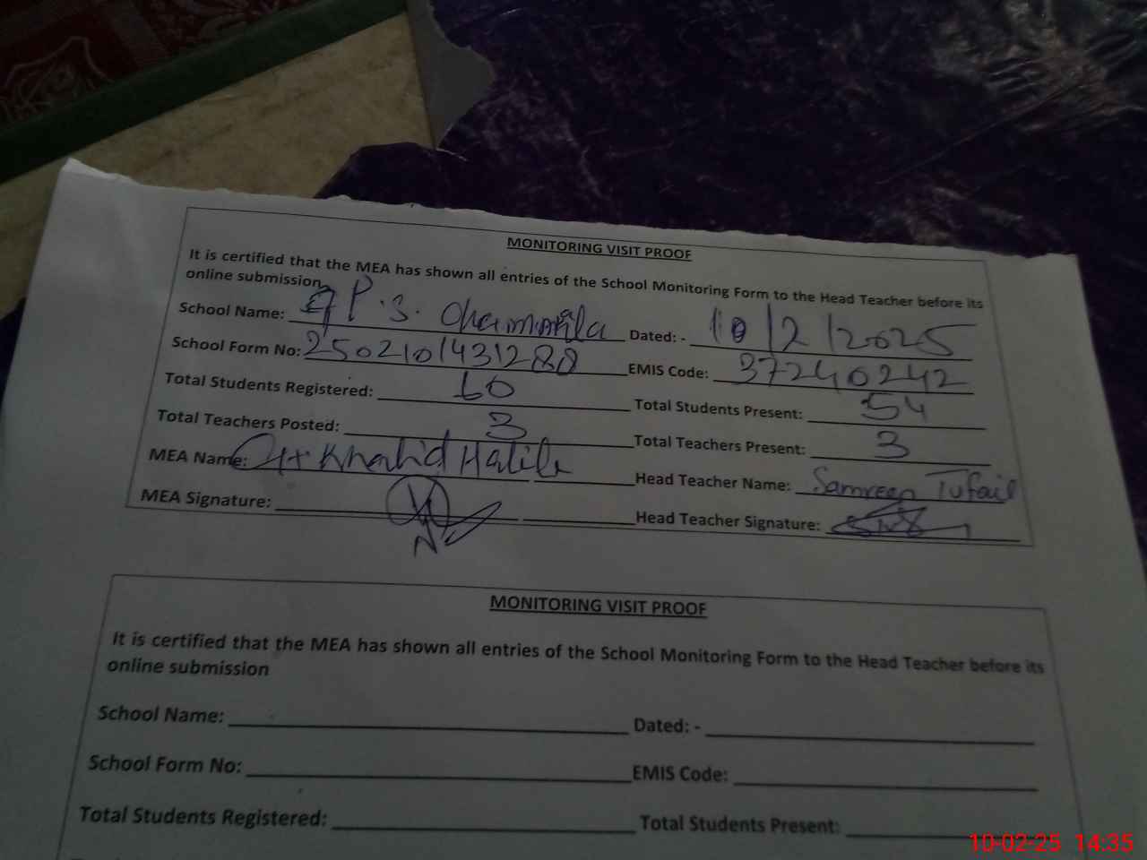 | Monitoring Date: 10-02-2025 | Start Time: 10-02-2025 02:30 PM | End Time: 10-02-2025 02:54 PM | Name of MEA: Kh**** ha**** | |