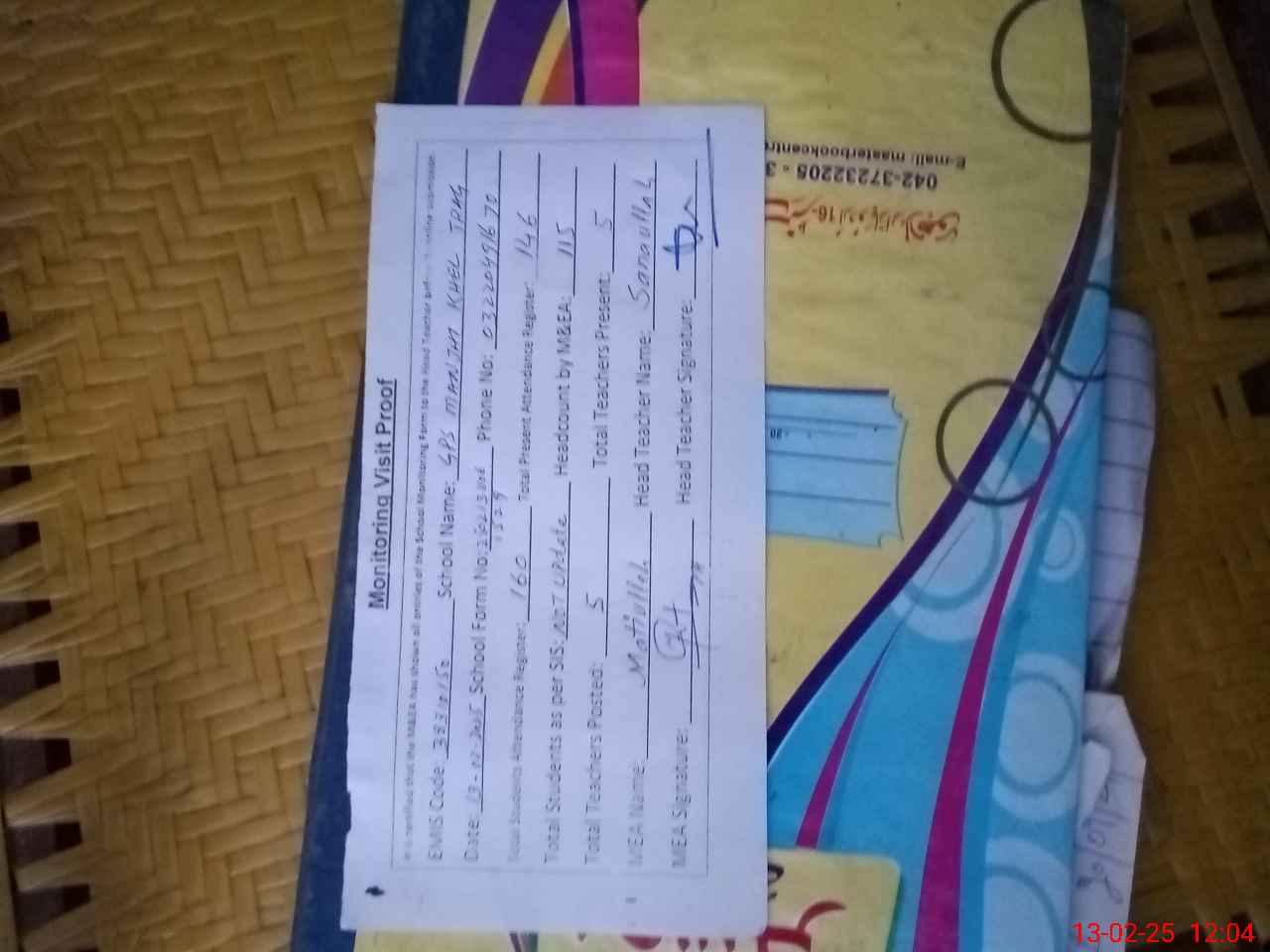 | Total no. of Classrooms: 6 No. of Classrooms Used for Teaching: 6 No. of Classrooms Storing Old Furniture, FTBs, etc: 0Comments if Any: One toilet nonfunctional SIS record not in line with student attendance registers ECE 42 on SIS 12 and katchi 8 one SIS 35 but register shows 22 not update head count 115 present but attendance registers shows 145 no soap at all wash points |