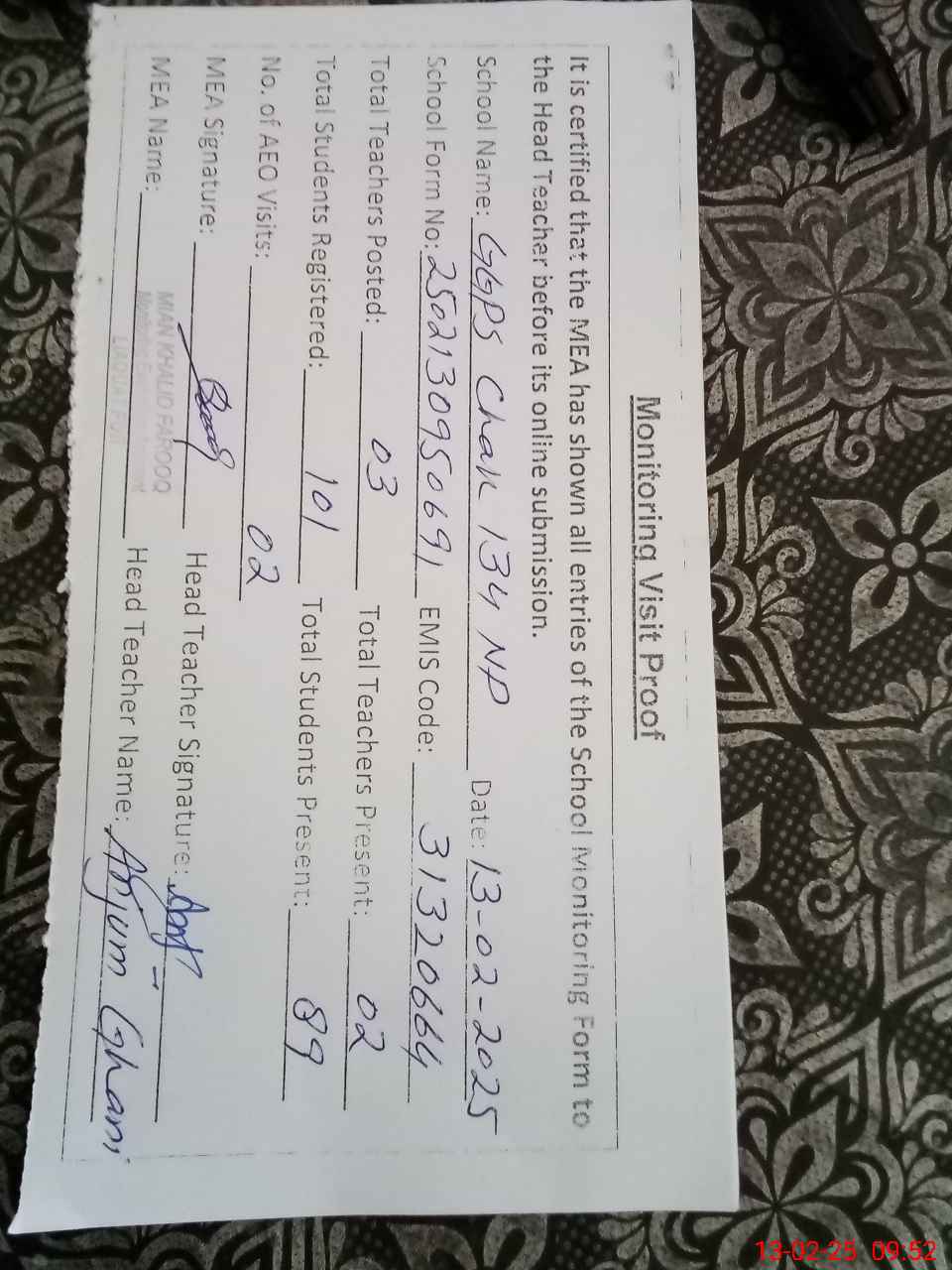 | Attendance Register | Head Teacher | MEA with School | Visit Proof |