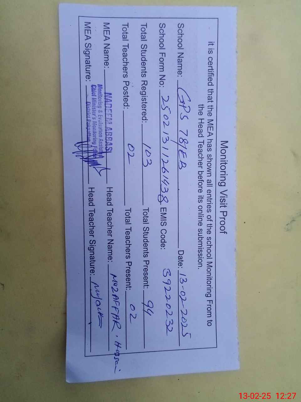 | Attendance Register | Head Teacher | MEA with School | Visit Proof |