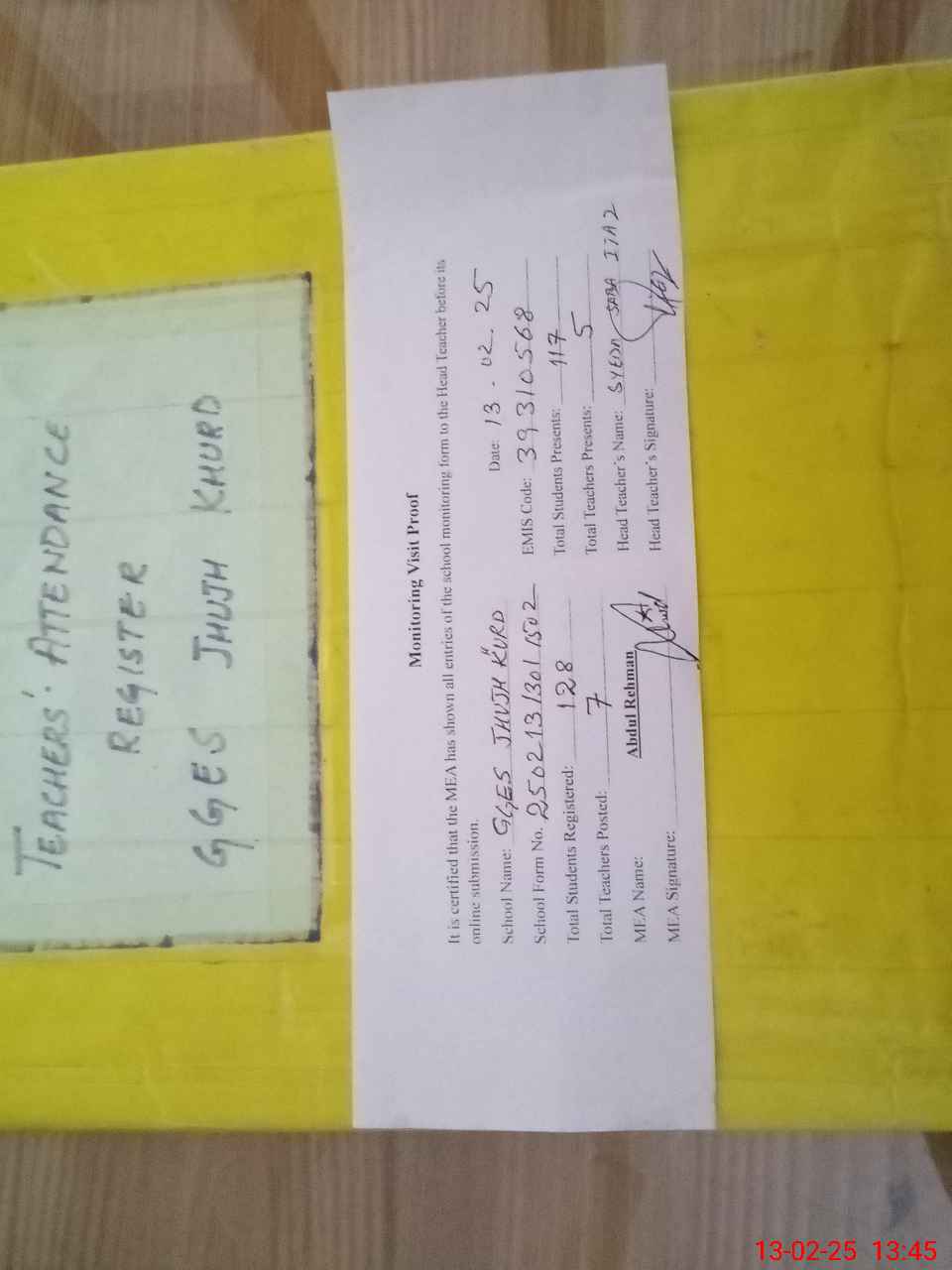 | Attendance Register | Head Teacher | MEA with School | Visit Proof |