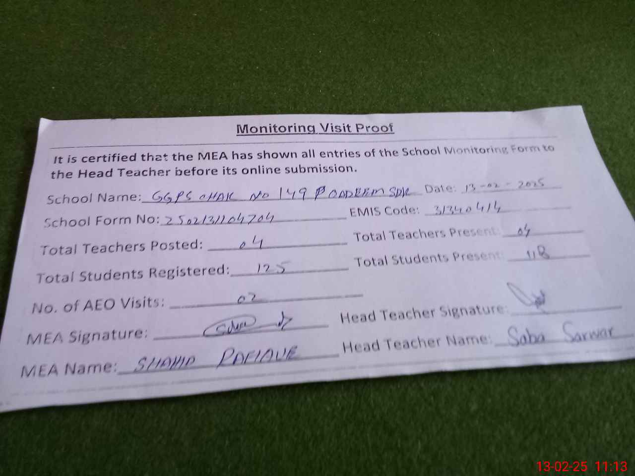| Attendance Register | Head Teacher | MEA with School | Visit Proof |