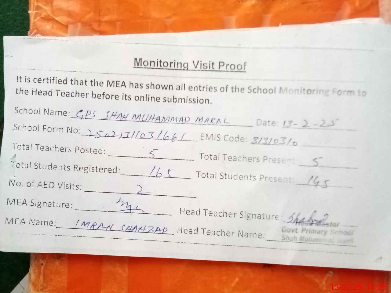 | Attendance Register | Head Teacher | MEA with School | Visit Proof |