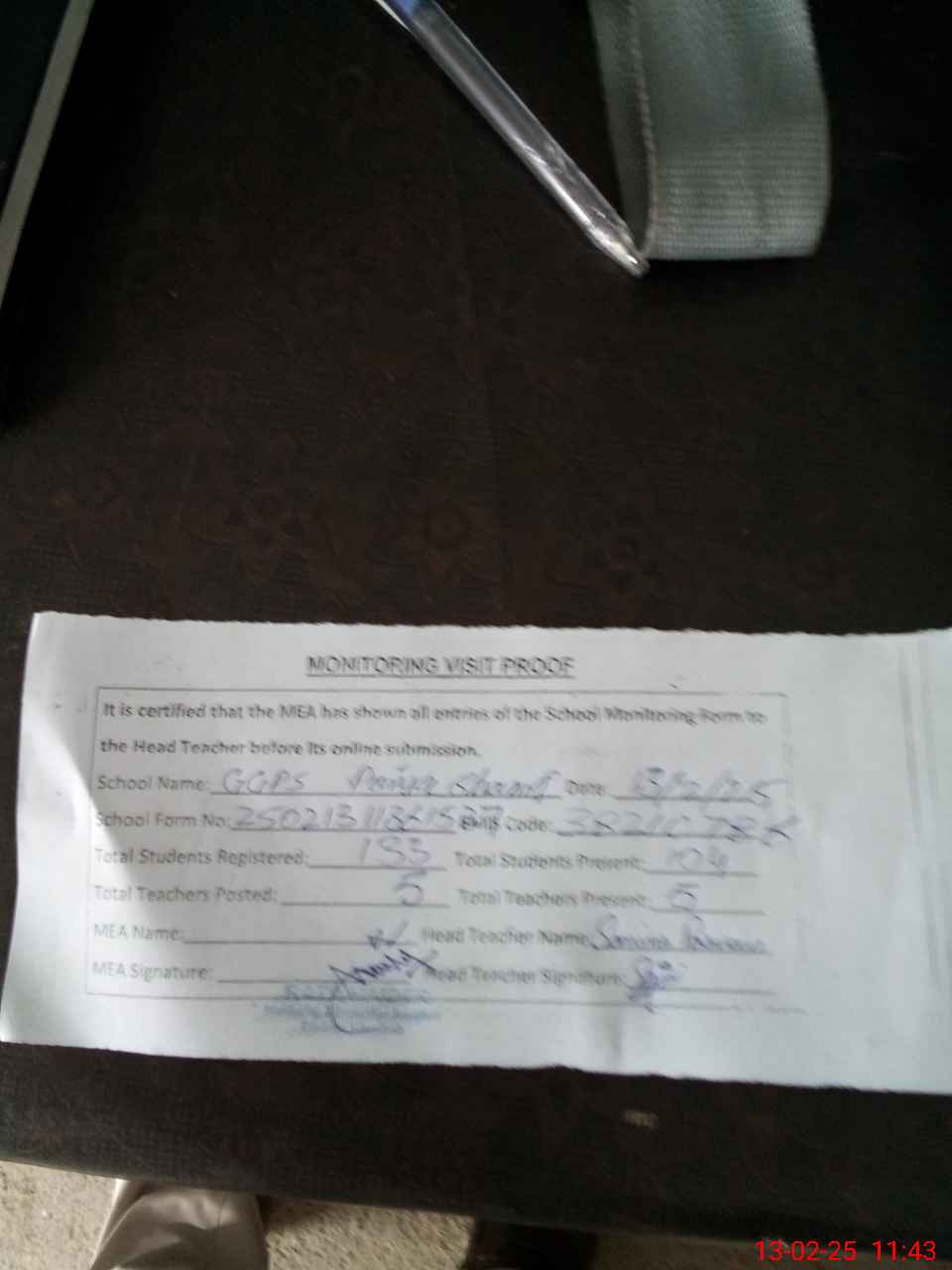| Attendance Register | Head Teacher | MEA with School | Visit Proof |
