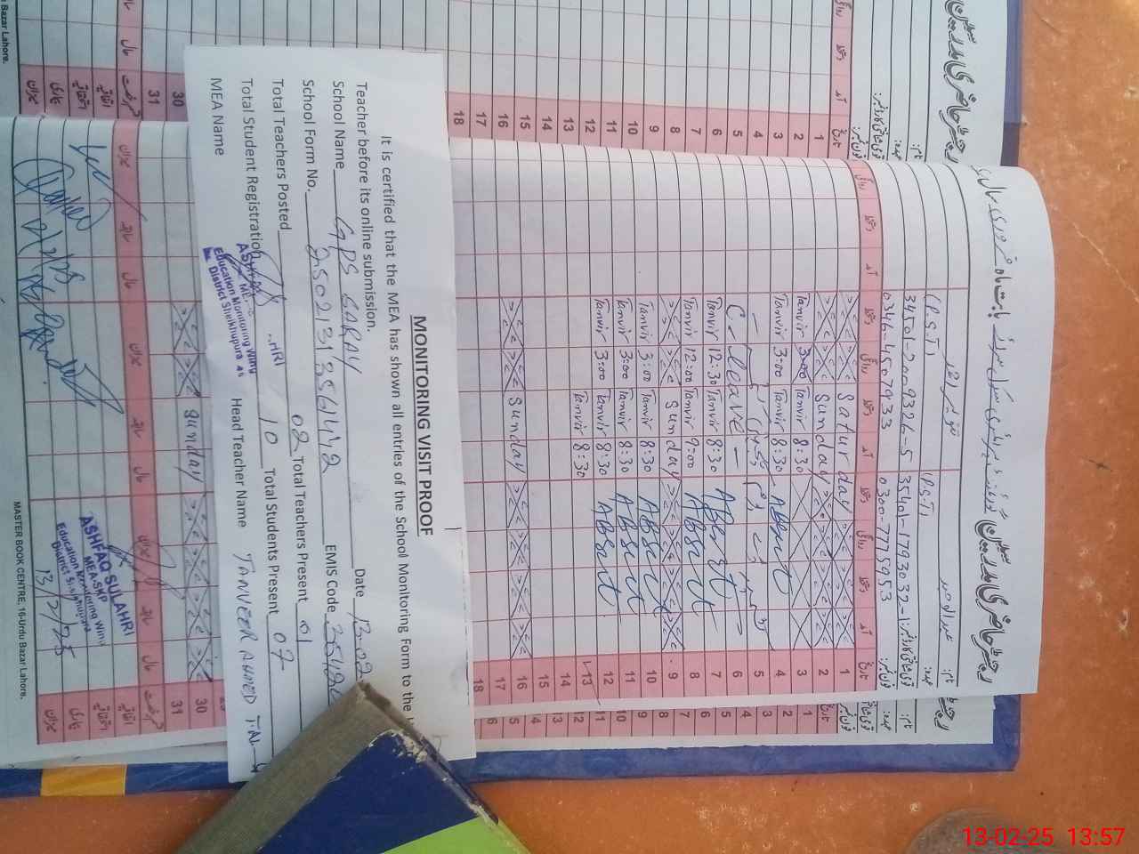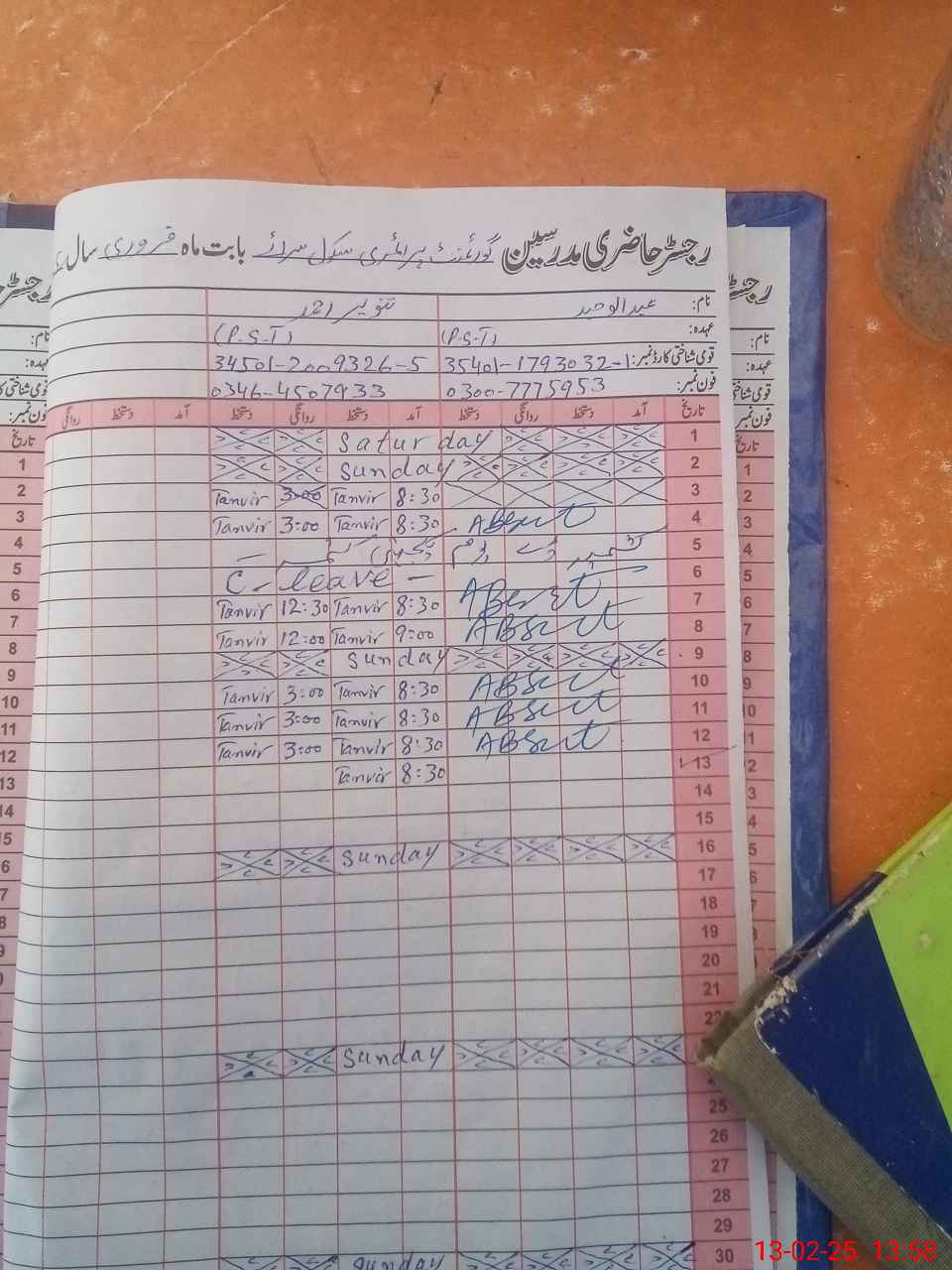 | Total no. of Classrooms: 2 No. of Classrooms Used for Teaching: 1 No. of Classrooms Storing Old Furniture, FTBs, etc: 0Comments if Any: NSB and FTF record not found Head teacher Abdul waheed was absent from the tow month |