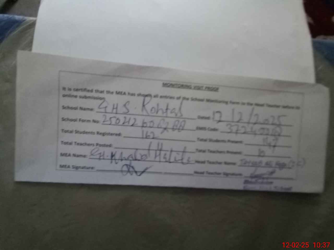 | Monitoring Date: 12-02-2025 | Start Time: 12-02-2025 10:07 AM | End Time: 12-02-2025 10:56 AM | Name of MEA: Kh**** ha**** | |