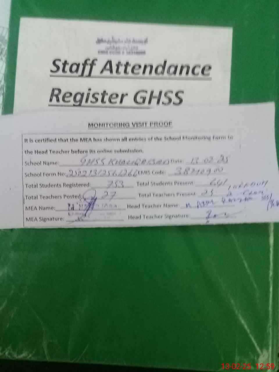 | Attendance Register | Head Teacher | MEA with School | Visit Proof |