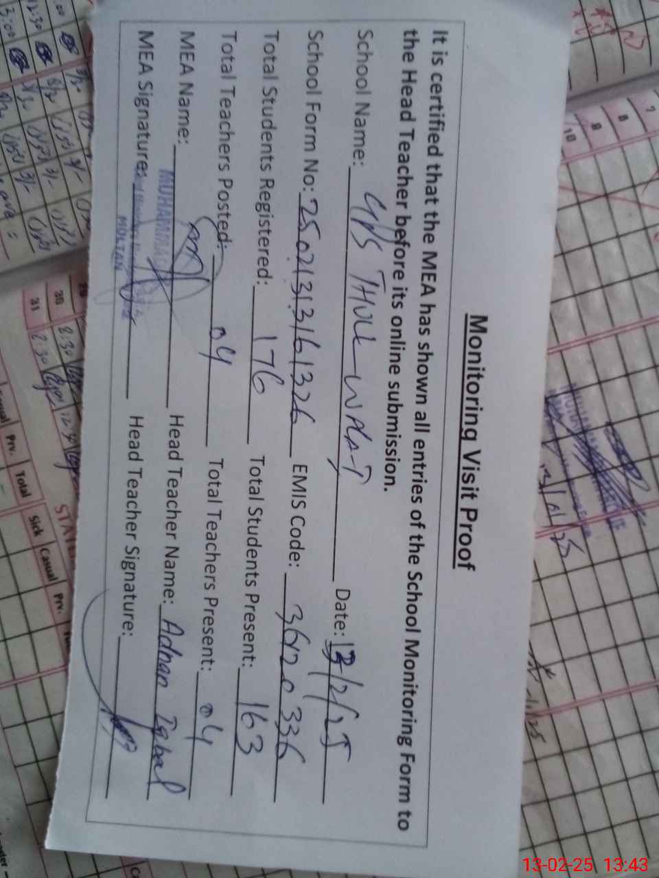 | Attendance Register | Head Teacher | MEA with School | Visit Proof |