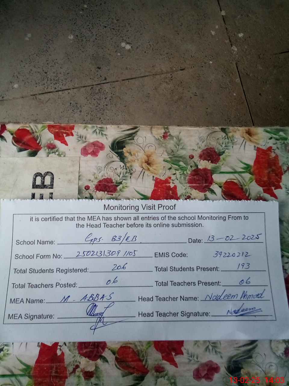 | Certified that this School was Inspected by the Undersigned MEA/DMO Today and the Information Stated Above is as Per Record. | |||||