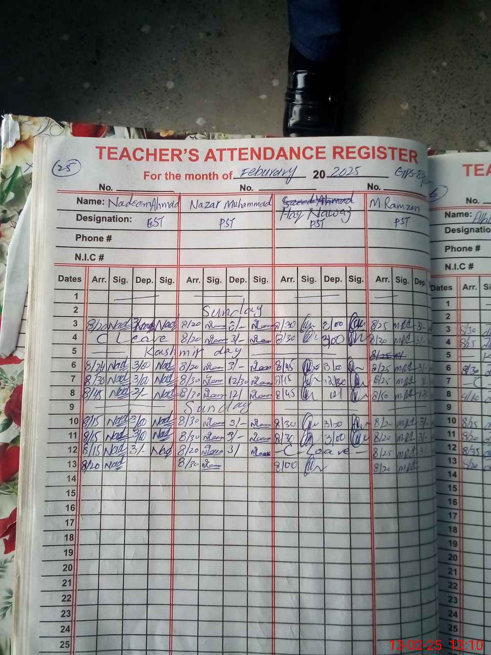 | CNIC | Full Name | Designation | R/C | Absence during last cal. month |