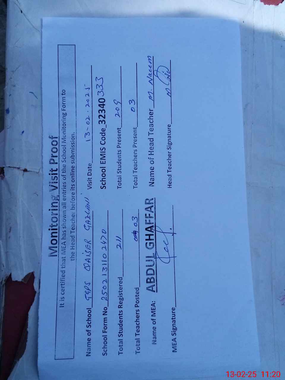 | Attendance Register | Head Teacher | MEA with School | Visit Proof |
