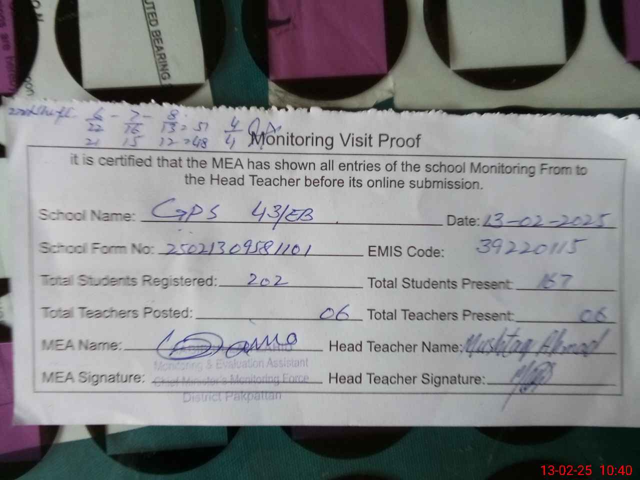 | Certified that this School was Inspected by the Undersigned MEA/DMO Today and the Information Stated Above is as Per Record. | |||||