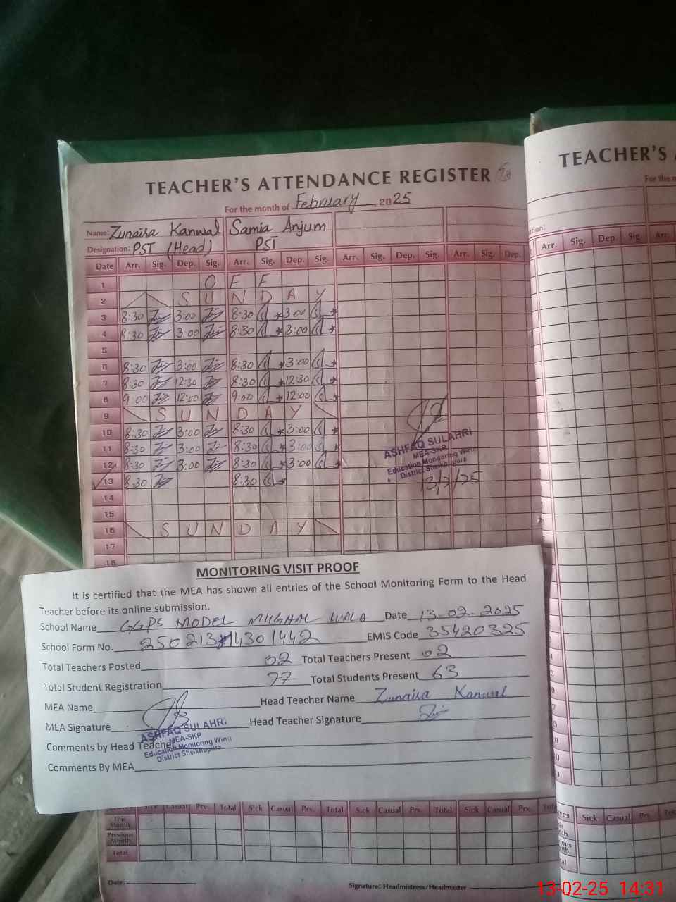 | Attendance Register | Head Teacher | MEA with School | Visit Proof |
