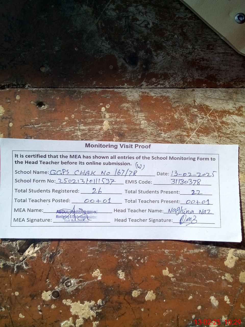 | EMIS Code: 31130378 | Name of School: GGPS CHAK NO167/7-R (w) | |||