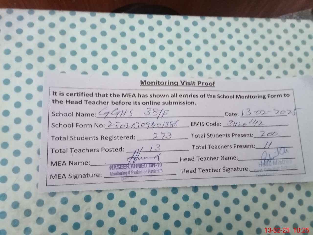| Certified that this School was Inspected by the Undersigned MEA/DMO Today and the Information Stated Above is as Per Record. | |||||
