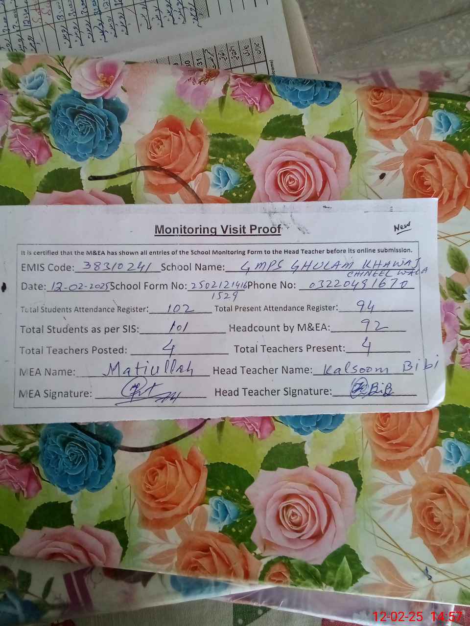 | EMIS Code: 38310241 | Name of School: GMPS GHULAM KHAWAJA CHEENAL WALA | |||