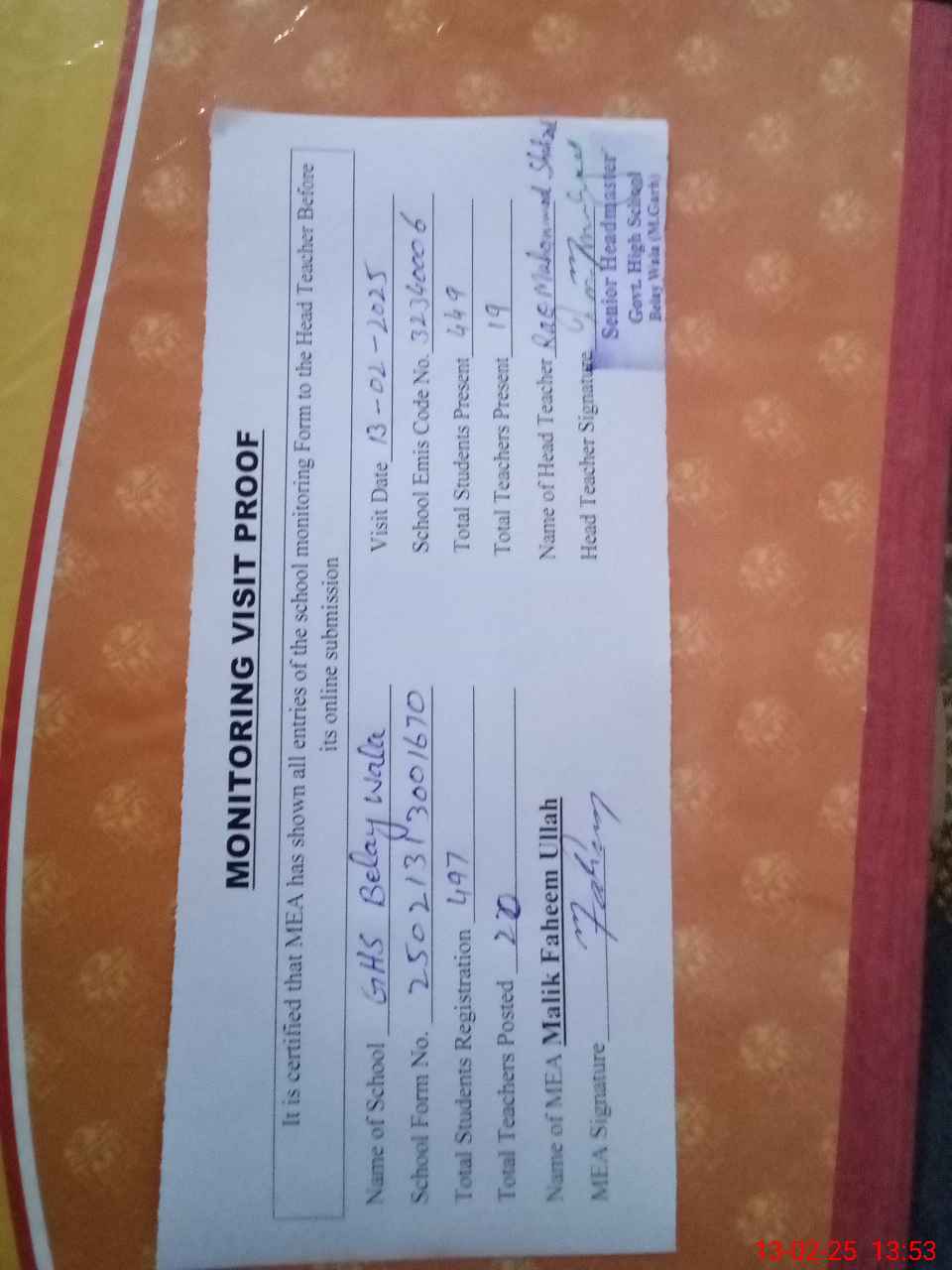 | Attendance Register | Head Teacher | MEA with School | Visit Proof |