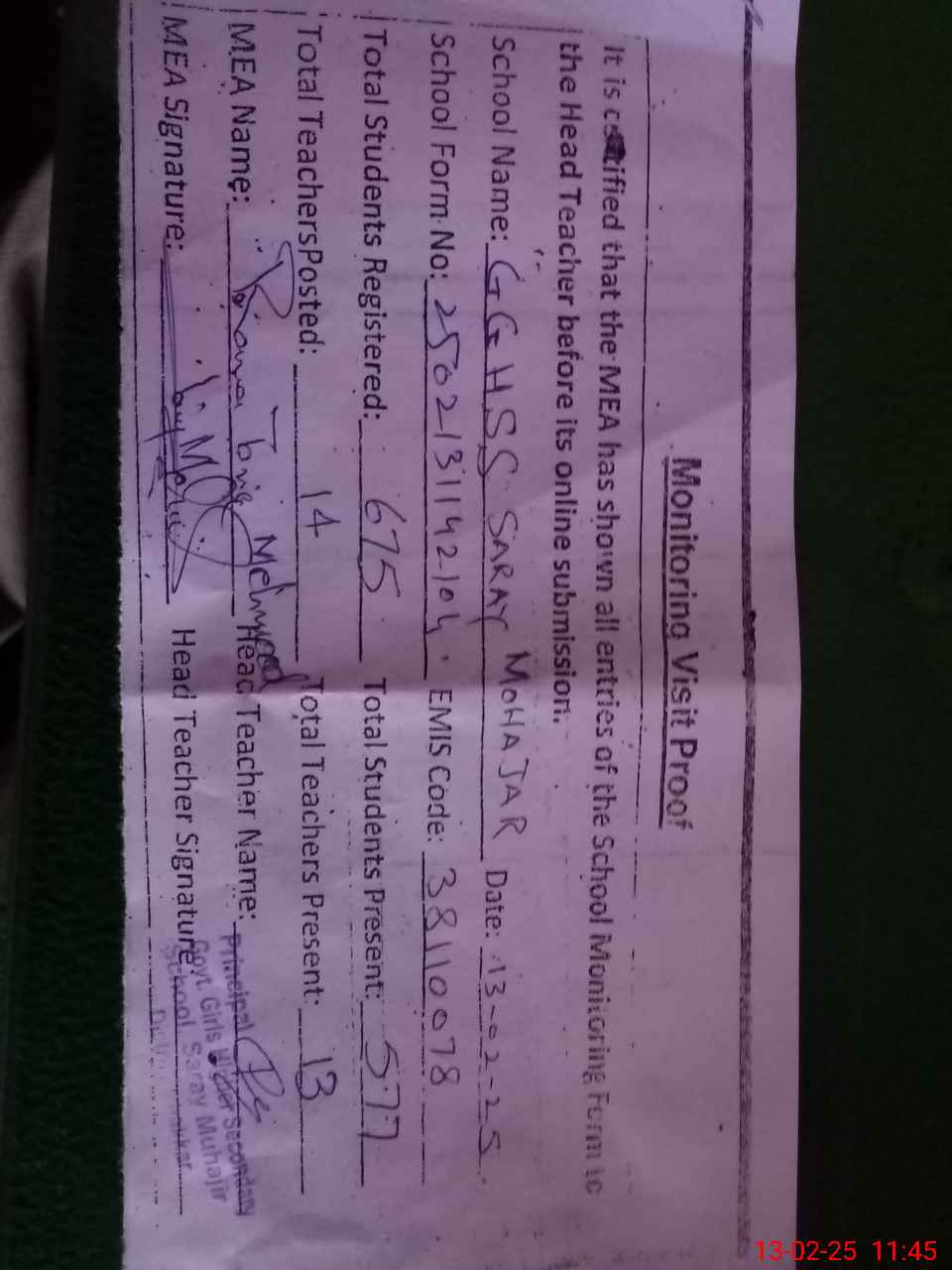 | EMIS Code: 38110078 | Name of School: GGHSS SARAI MUHAJAR | |||