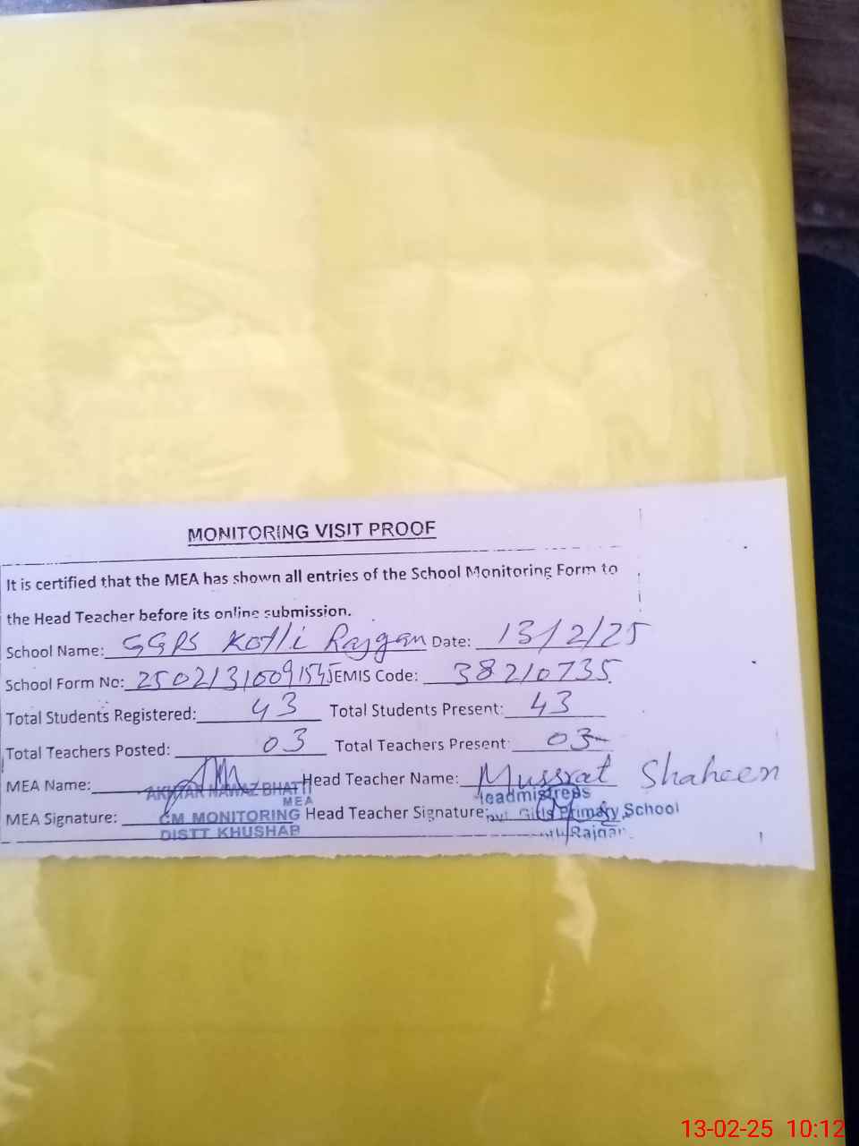 | Attendance Register | Head Teacher | MEA with School | Visit Proof |