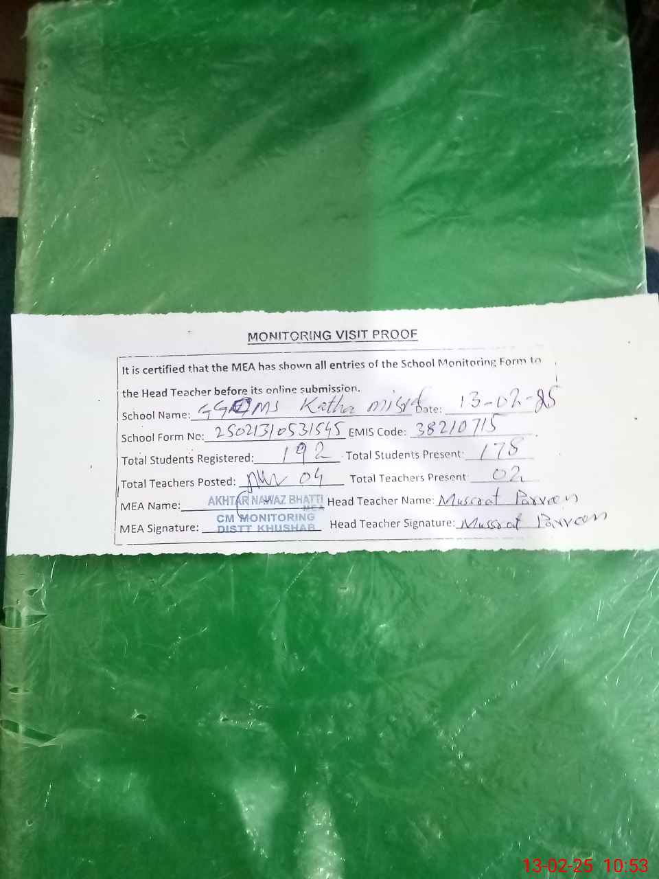 | Attendance Register | Head Teacher | MEA with School | Visit Proof |