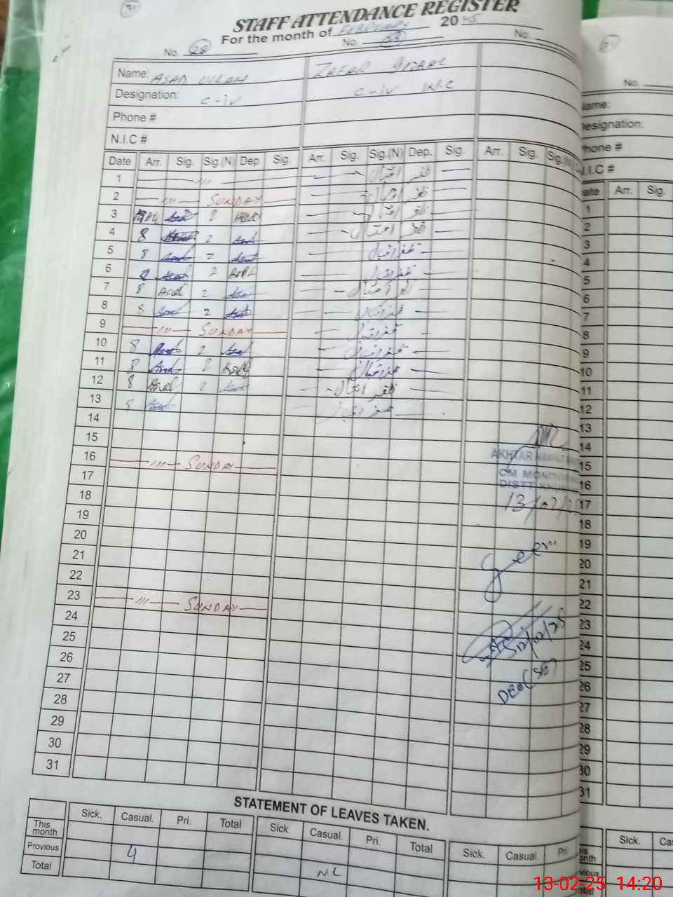 | CNIC | Full Name | Designation | R/C | Absence During Last Calender Month |