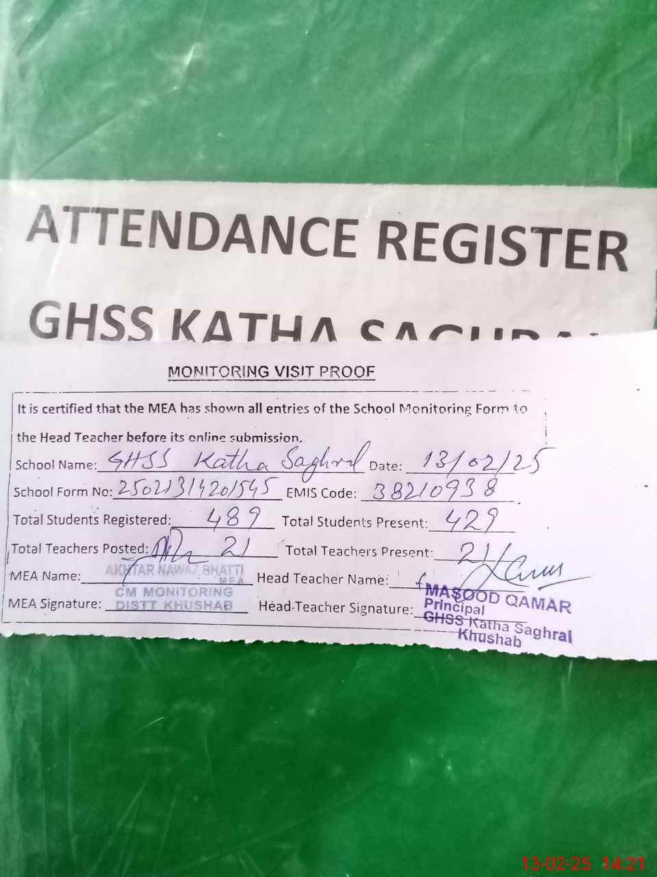| Attendance Register | Head Teacher | MEA with School | Visit Proof |