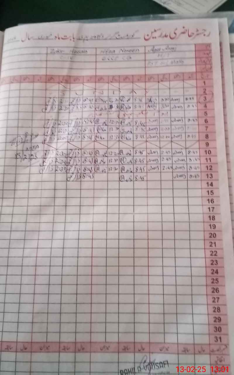 | CNIC | Full Name | Designation | R/C | Absence During Last Calender Month |
