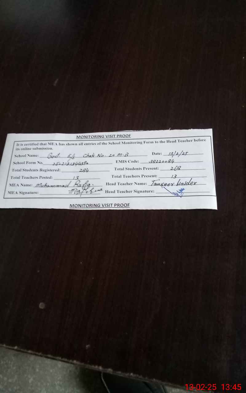 | EMIS Code: 38220084 | Name of School: GES CHAK NO. 20/MB | |||