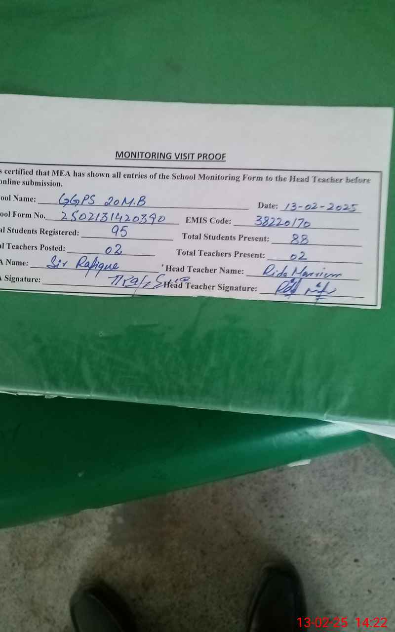 | EMIS Code: 38220170 | Name of School: GGPS CHAK NO 20 MB | |||