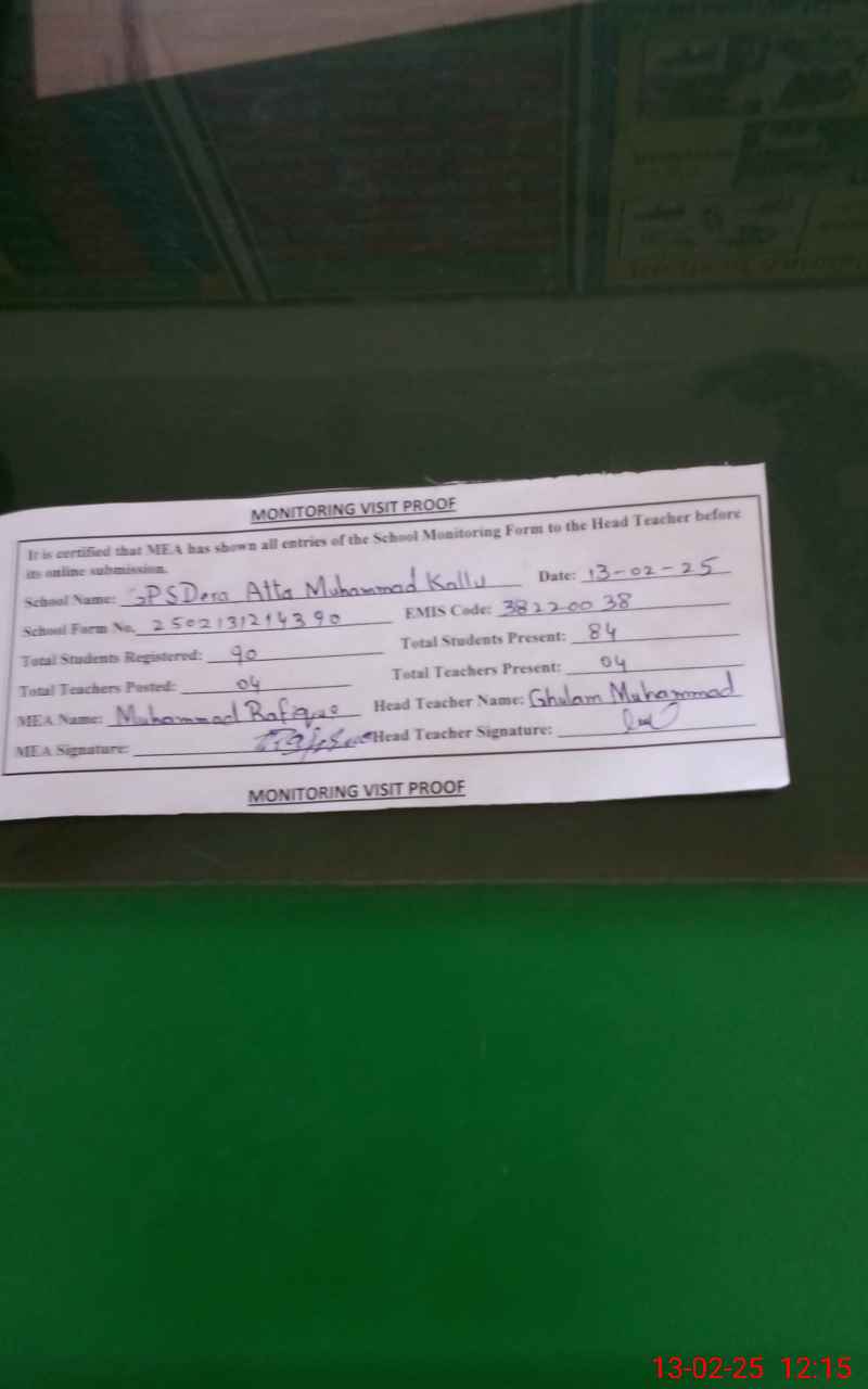 | EMIS Code: 38220038 | Name of School: GPS DERA ATTA MUHAMMAD KALOO | |||