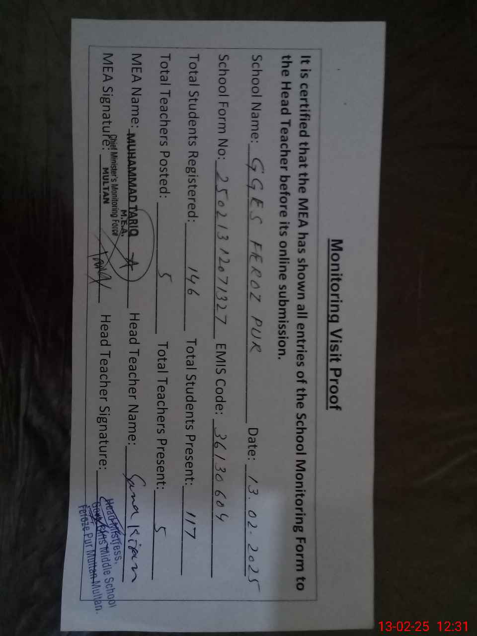| Attendance Register | Head Teacher | MEA with School | Visit Proof |