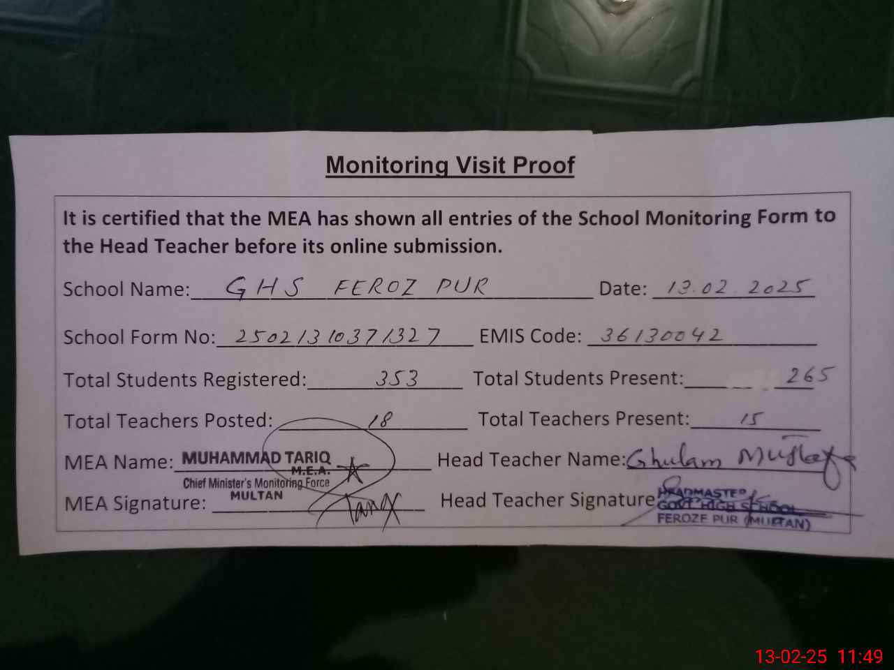 | EMIS Code: 36130042 | Name of School: GHS FEROZ PUR MOUZA FEROZEPUR P/O SKINDRA ABAD TEH. & DISTT. MULTAN | |||