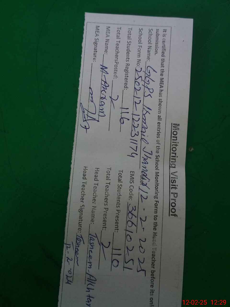 | EMIS Code: 36610251 | Name of School: GGPS ISMAIL JHANDEER | |||