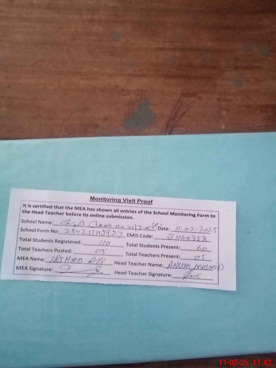 | Attendance Register | Head Teacher | MEA with School | Visit Proof |