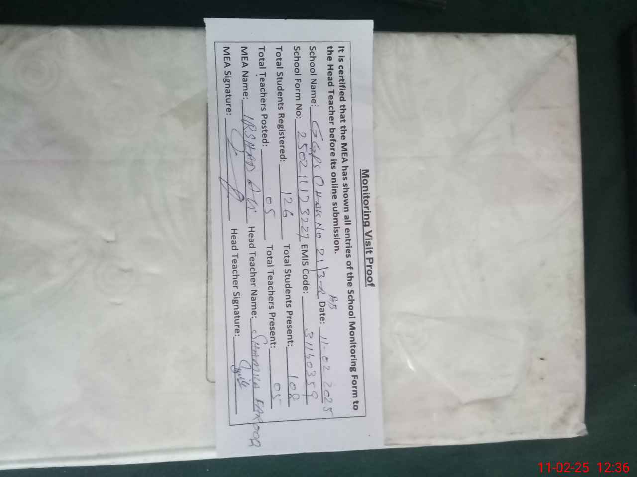 | Attendance Register | Head Teacher | MEA with School | Visit Proof |