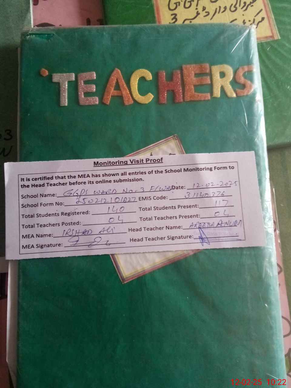 | Attendance Register | Head Teacher | MEA with School | Visit Proof |