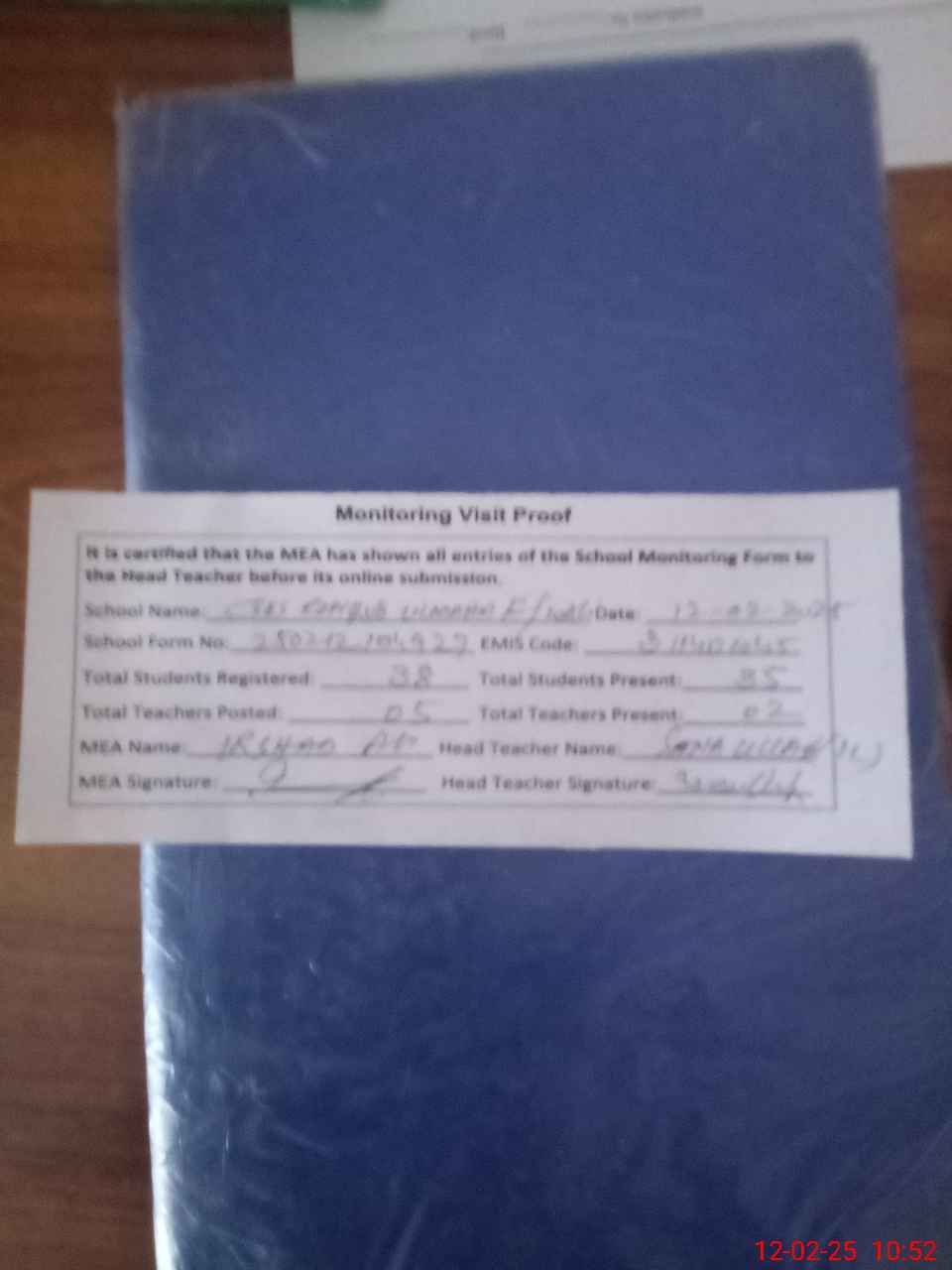 | Attendance Register | Head Teacher | MEA with School | Visit Proof |